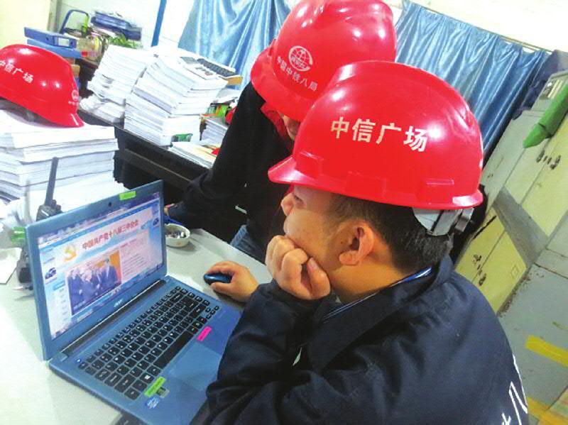 11月9日至12日,党的十八届三中全会在北京召开,中铁八局广大干部员工通过电视、网络、报纸、手机等媒体,收听收看了相关会议情况,积极关注中央关于全面深化改革的决策部署。图为中铁八局建筑公司中信广场项目员工通过网络学习十八届三中全会精神。张庆爽 陈源 摄影