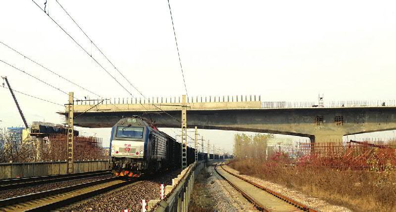 11月19日,中铁十局承建的河北省邢衡高速公路上跨京广铁路立交桥转体成功。该桥全长559.5米,位于京广铁路管庄至邢台站区间,上跨京广铁路、旭阳焦化厂专用线铁路、G107国道,施工转体85.2度,转体段自重14500吨。图为大桥转体后,列车穿过立交桥。支运宝 王佑强 摄影报道