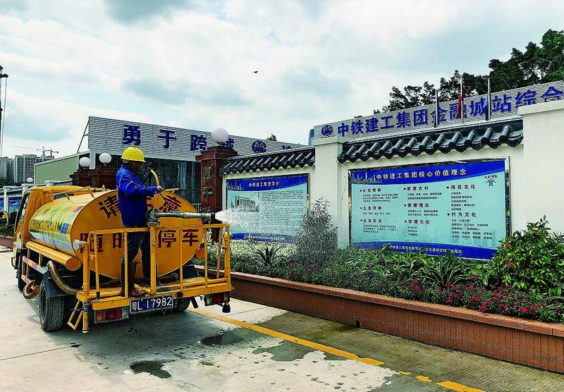 近日, 中铁建工广州分公司广州市金融城站综合交通枢纽项目部选用的泥浆处理零排放系统正式投入使用。该系统可日均生产清水400立方米。图为项目部使用再生清水浇灌花草。 张海东 摄