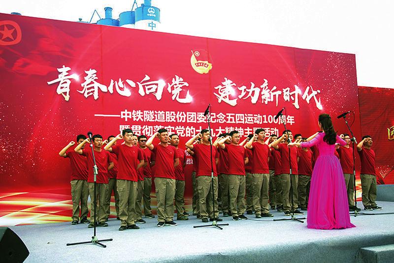 4月26日, 中铁隧道局团委在汕头海湾隧道施工现场, 举办纪念五四运动100周年活动, 激励青年员工传承五四精神, 在工程建设中不断奉献才智。图为青年代表合唱 《光荣啊, 中国共青团》 时的场景。 冯晓博 王炎宾 摄影报道