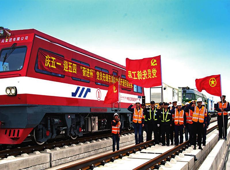 五一节前, 中铁三局线桥公司郑万项目以 “我为党旗增光彩,保质保量促生产” 为主题, 开展庆五一、 迎五四 “奋进杯” 党员先锋劳动竞赛活动。活动设置6个竞赛小组, 让党员担任组长, 以充分发挥模范带头作用, 推进项目创优创效。图为铺轨组进行誓师动员时的场景。 张传罡 姚霁芳 摄影报道