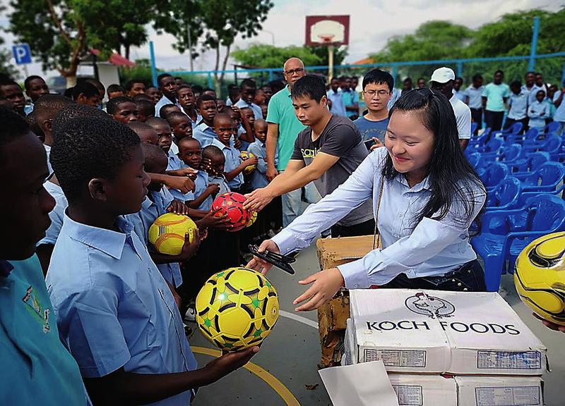 4月27 日,中铁四局一公司、设计院、建筑公司在安哥拉项目员工,到安哥拉首都罗安达赞古区的国家警察总局附属孤儿学校慰问,向学校捐赠了椅子、文体用品、食品等慰问物资。图为中铁四局员工给学生分发足球。 项海英 冯帆 摄影报道
