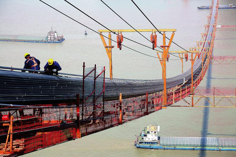 5月10日, 随着两根分别长1934米、 重46吨的主缆索股从长江北岸过江, 固定到南锚碇锚杆上, 中铁大桥局承建的五峰山长江大桥704 根索股全部架设完成。该桥是我国第一座公铁两用悬索桥, 也是世界上荷载最重、 行车速度最快的公铁两用悬索桥。全桥设计2根主缆, 每根索股由 127 根直径5.5毫米、 抗拉强度1860兆帕的镀锌铝高强度钢丝组成,单根主缆拉力高达9万吨。 常美兰 崔永兴 摄影报道