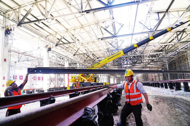 近日, 中铁七局西安公司承建的京张高铁北京北动车所检查库主体工程完工, 进入装修及设备安装阶段, 计划6月底前结束施工。北京北动车所将承担京张高铁动车组检修和整备等工作。图为5月6日施工现场。 李丹 摄