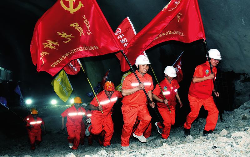 历经两年半奋战, 5月8日12时18分, 由中铁五局贵州公司承建的太焦高铁特长隧道—襄垣隧道出口至3号斜井区间贯通, 该区间共长4151米。襄垣隧道全长10.15千米, ⅣⅤ级围岩占比76%, 是中国铁路总公司确定的高风险控制性工程, 目前正洞开挖累计完成8225米。图为施工人员奔向贯通“会师” 点。 任梅 周彤辉 摄影报道