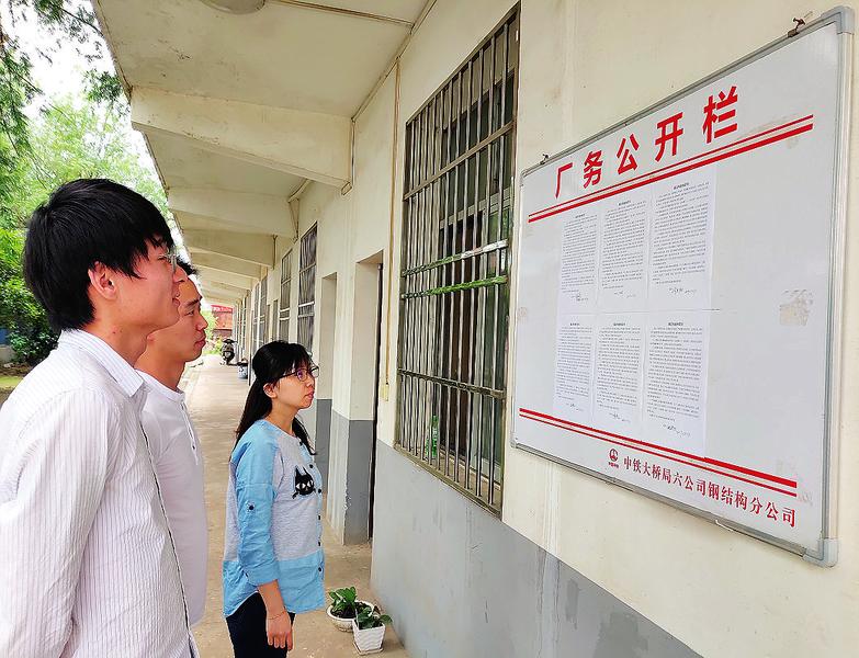 5月20日, 中铁大桥局六公司钢结构分公司党组织通过厂务公开的方式,将领导班子所签订的廉洁从业承诺书向全体员工公开,接受群众监督, 引起员工驻足观看。 汤艳芬 张丽琴 摄影报道