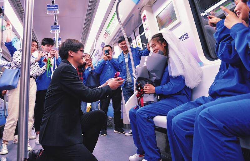 5月20日, 郑州地铁5号线开通试运营, 参与建设的中铁电气化局三公司员工刘欣, 在首趟列车上向在一起共同奋战了508天的女朋友任静求婚。在众多地铁乘客的见证下, 任静幸福地答应了刘欣的求婚。 吕瑞谦 刘鹏 摄影报道
