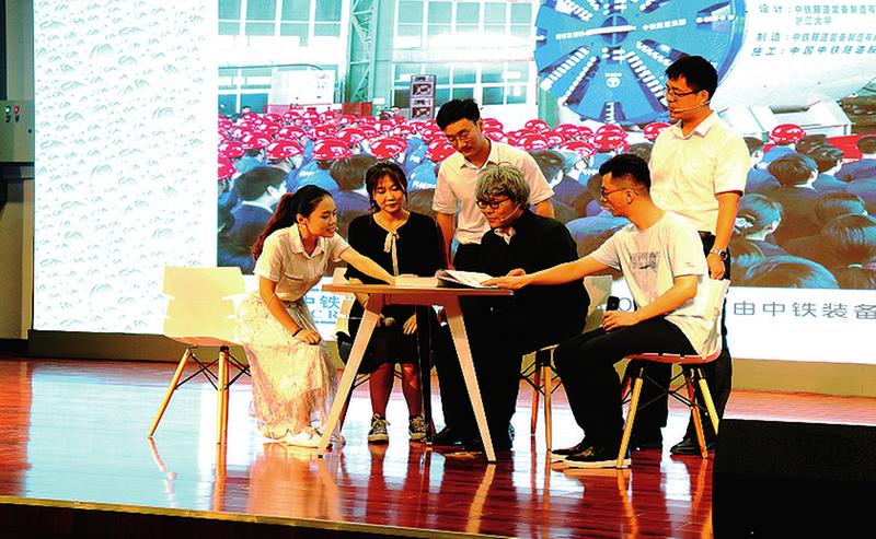 7月19日, 中铁工业旗下中铁装备设计研究总院党委围绕 “不忘初心、 牢记使命” 主题教育, 举办创新故事大赛, 通过11个创新故事引导员工守初心、 悟初心、 践初心。图为员工表演情景剧 《盾构—时光》 。 张冬 摄