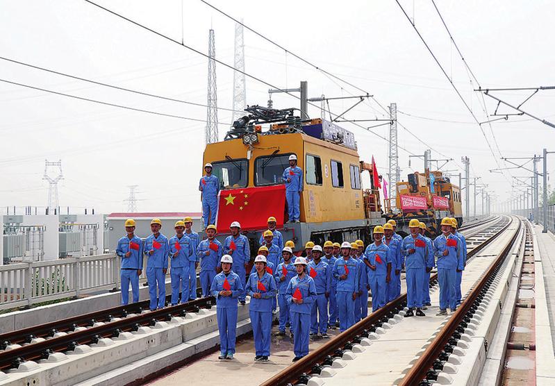 近日, 中铁电气化局鲁南高铁LNSD-1标项目部组织40余名党员及优秀青年员工, 在施工现场合唱 《我和我的祖国》 , 向新中国成立70周年献礼。 张文彭 摄