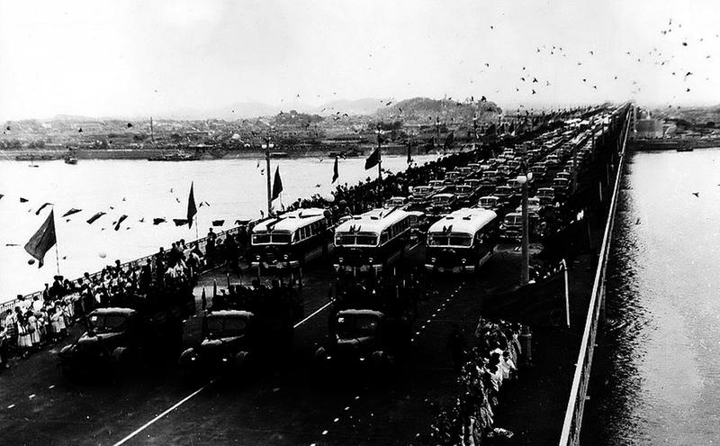 ①1957年10月15日, 在武汉长江大桥通车仪式上, 300余辆汽车依次通过大桥, 5万余名干部群众参与庆祝。