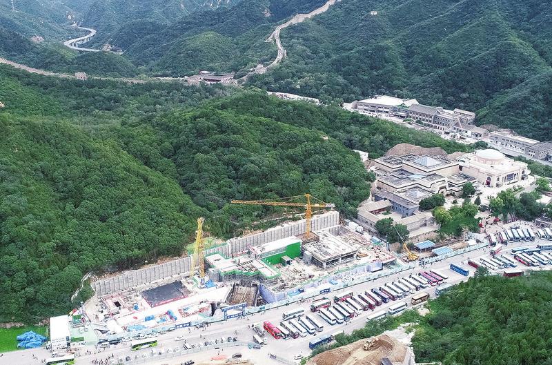 京张高铁八达岭长城站毗邻八达岭长城, 总建筑面积49500平方米, 分成地面站房和地下站两部分。地下站位于景区山体下方102米处, 是目前国内埋深最大的高速铁路地下站; 车站层次多、 洞室数量大、 洞型复杂、 交叉节点密集, 也是目前国内最复杂的暗挖洞群车站。 徐博 摄