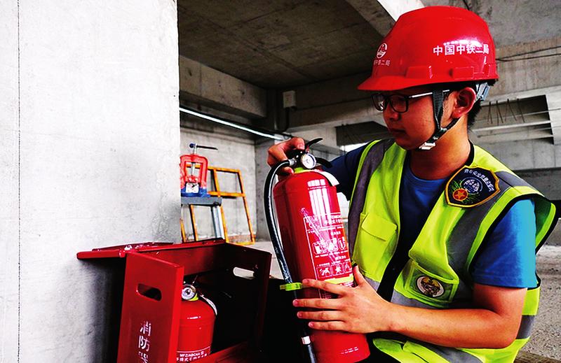 日前, 中铁二局电务公司成都地铁项目部青安岗成员针对当地高温持续不降的情况, 重点对项目安全用电和防火设施进行针对性检查, 保障大干期间施工生产顺利进行。图为青安岗成员检查消防栓、 灭火器是否配备完好。 曾诗媛 李永杰 摄影报道