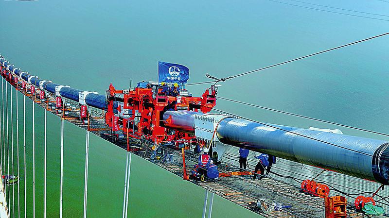 ① “五一” 期间, 中铁大桥局五峰山长江大桥建设者为大桥主缆进行缠丝、 缠包带等防腐施工, 给主缆穿上2层 “防护衣” 。 常美兰 崔永兴 摄影报道