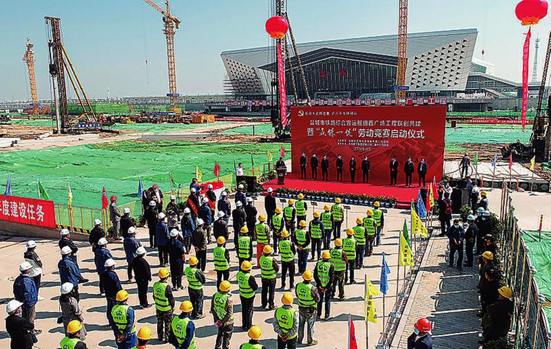 ②4月29日, 中铁建工上海分公司盐城客运枢纽西广场项目部启动联创共建暨 “五保一促” 劳动竞赛, 在劳动节来临之际全面掀起大干高潮, 力争项目年底前与盐通铁路同步投入使用。 杨德正 摄