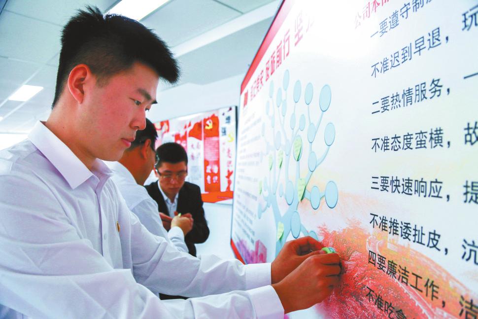 ②5月11日,中铁六局太原公司党委开展主题党日活动,组织员工到中共太原支部旧址纪念馆、山西文旅数字体验馆参观学习,并举行公司本部作风建设启动仪式。图为员工在“企业之树”上粘贴作风建设承诺卡。
