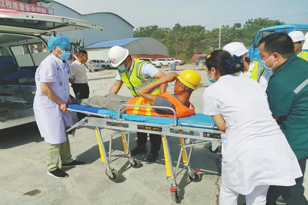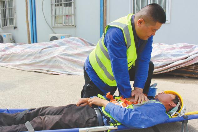 ②6月2日,中铁六局太原公司尖草坪街道改造工程项目部在施工现场开展防汛应急演练。图“溺水人员”心肺复苏抢救演示。