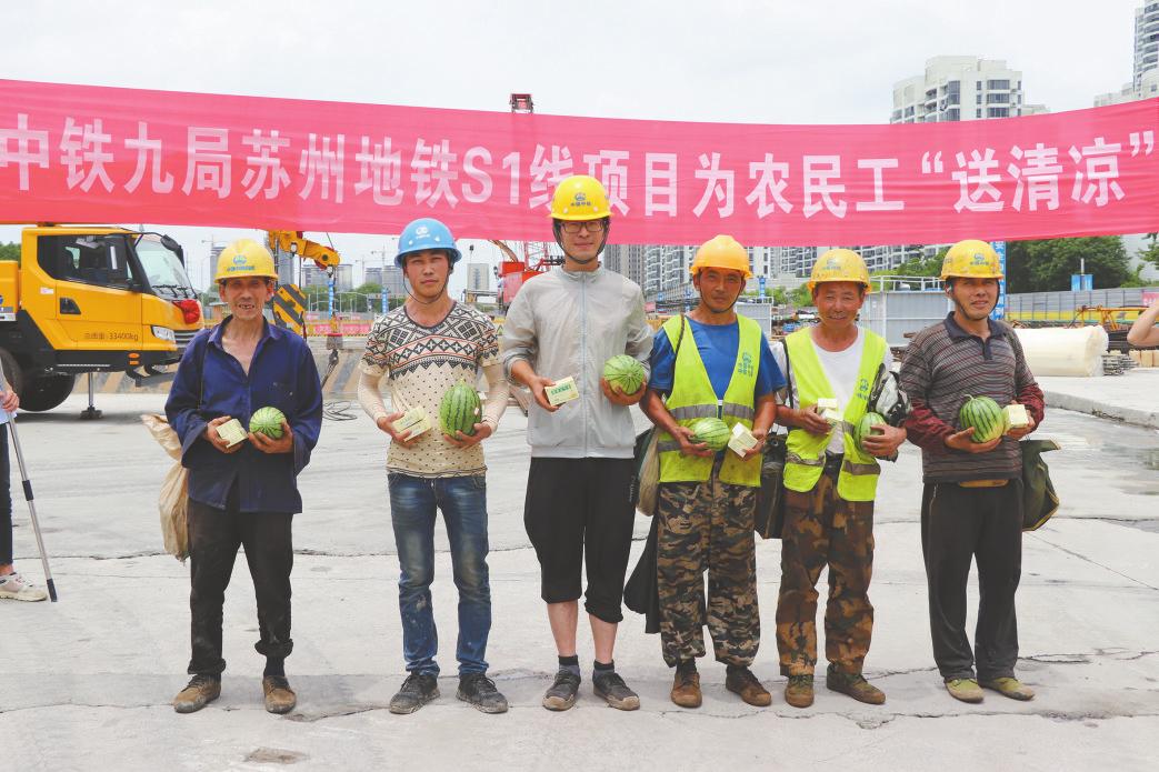 ⑥6月6日,中铁九局苏州地铁项目部为农民工送去了消暑降温慰问品。