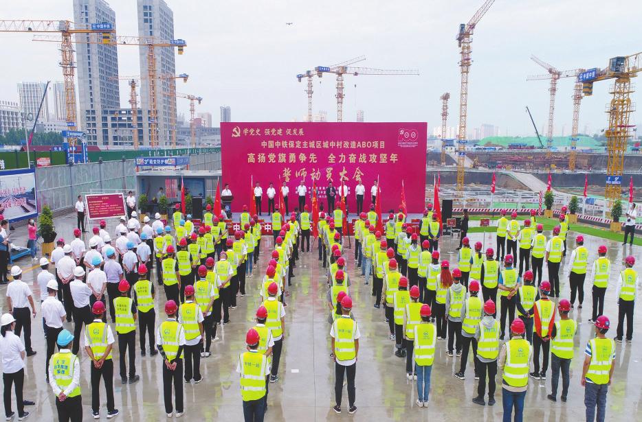 ②6月10日,中铁投资党委“学党史强党建促发展”誓师动员大会在保定市莲池区东百楼、蔡庄、后营三村连建安置区举行,全面吹响了项目主体攻坚的冲锋号角,向建党100周年献礼。