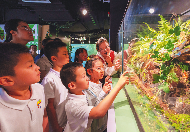 8月9日至10日,中铁上海局一公司本部举办“候鸟归巢,让爱无阻”员工子女反探亲活动。45位“小候鸟”参与活动。图为孩子们正在参观动植物。