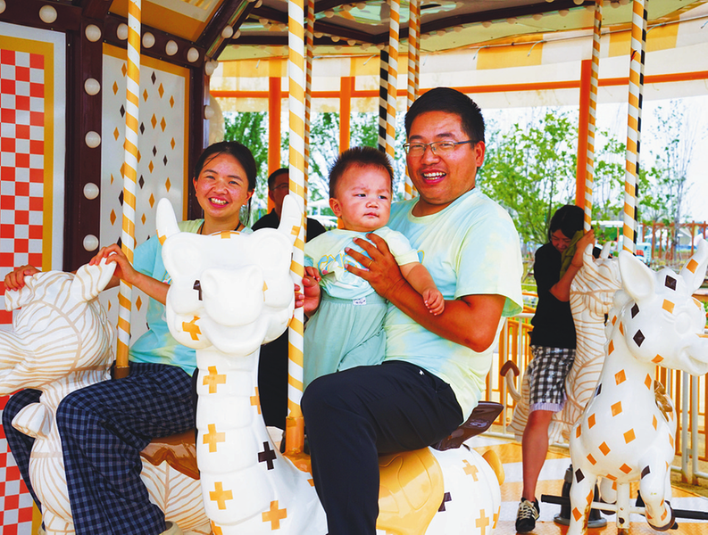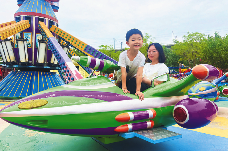 8月10日,中铁四局南京分公司宿迁大道项目联合区域各项目部开展“‘宁’聚童趣,逐梦同行”小候鸟夏令营活动,来自9个家庭共计31名员工及家属子女参与。图为员工与其子女一起乘坐旋转木马。