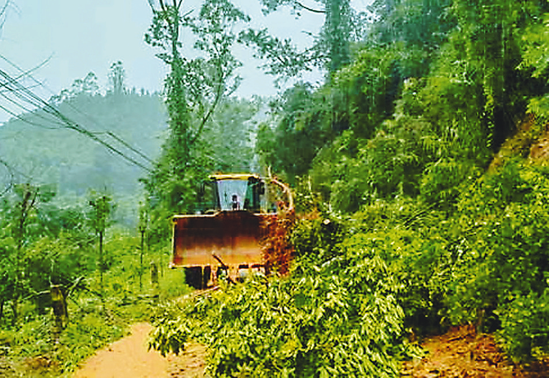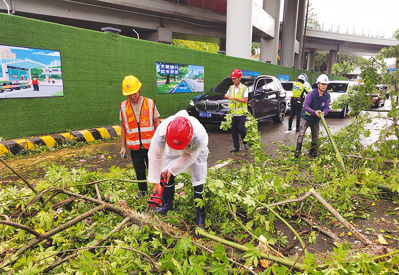 图为中铁四局五公司深圳侨城东路北延通道项目部积极协助当地交管部门,清理倒伏公路上的树木等障碍物。