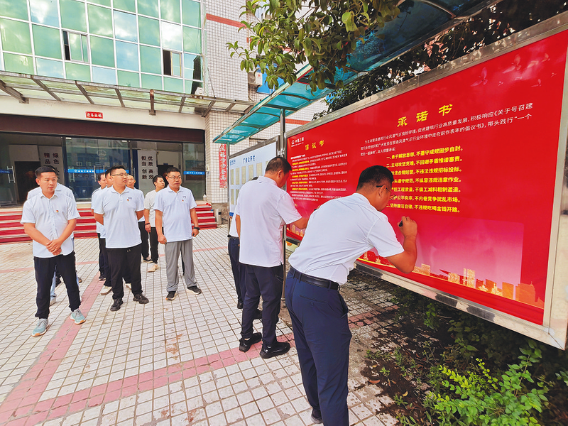 《关于号召建筑行业党组织和广大党员在营造风清气正行业环境中走在前作表率的倡议书》发布后,中铁三局桥隧公司党委积极响应,精心组织各单位宣贯倡议书,引导员工积极响应倡议、自觉践行倡议,共同营造风清气正的市场环境。图为所属西渝八标项目部组织开展承诺书签名活动。