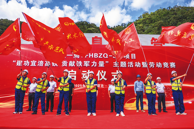 近日,中铁一局宜涪高铁3标项目部在亭子山隧道出口举行“建功宜涪高铁贡献铁军力量”主题活动暨劳动竞赛启动仪式,激励参建员工围绕重点工程全面攻坚,确保顺利完成年度施工目标。图为授旗仪式。