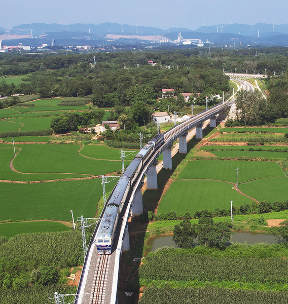 10月15日,中铁六局天津公司施工的“北煤南运”战略重要通道内蒙古浩勒报吉至江西吉安铁路(简称浩吉铁路)湖北荆门北至子陵联络线建成通车。该联络线全长7213米,打通焦柳、浩吉两大干线铁路,至此北上或南下物资都获得一条便捷通道,进一步完善区域铁路网布局,优化区域铁路运输组织,为路网能力提升提供了有力支撑。图为石家湾大桥。