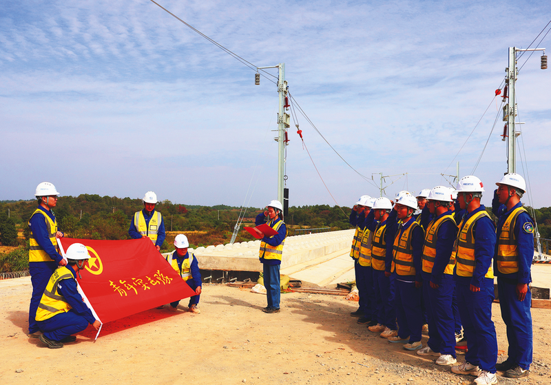 近日,中铁武汉电气化局昌九高铁全线首条接触网承力索自南昌昌北机场站附近开始架设。施工启动之际,项目部同步举行“擎青春旗帜,筑昌九精品”青年突击队授旗仪式,激励青年员工弘扬团队协作精神、发挥创新活力,攻坚克难、勇挑重担,确保项目关键节点按期完成,保障工期目标顺利实现。