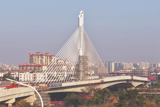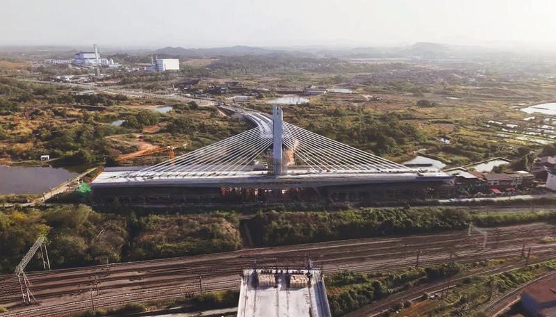 11月27日,中铁大桥局承建的江西省鹰潭市信江南路延伸工程跨铁路特大桥8号墩主桥转体就位。该工程全长约3.486公里,设计时速40公里。其中跨铁路特大桥全长约795米、宽32.5米。主桥为转体结构,位于8号墩,为(2×127)米矮塔斜拉桥,主塔高52米,重约3.8万吨。当日,在2台千斤顶的牵引下,历时80分钟,平稳旋转84.5度,主桥跨过沪昆下行线及多股编组站铁路轨道。