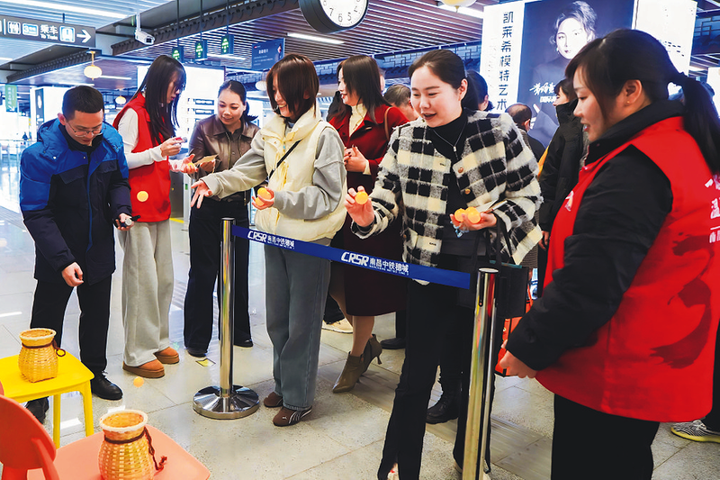 12月5日,中铁电气化局南昌中铁穗城轨道公司在南昌地铁3号线绳金塔站举办“青年文明号开放日”活动,活动设置“文明乘车知识答题”“传统投壶挑战”“打卡送祝福”等多个互动环节。图为“传统投壶挑战”。