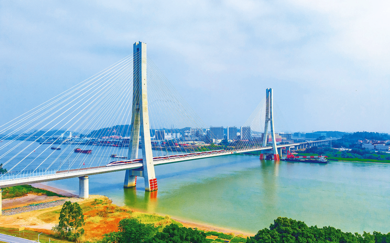 图为动车组通过中铁广州局承建的广湛高铁佛山特大桥跨东平水道斜拉桥。