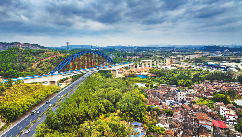 近日,由中铁七局承建的珠海至肇庆高速铁路江门至珠三角枢纽机场段(简称珠肇高铁江机段)跨广明高速公路特大桥连续梁拱拱部合龙。该连续梁拱位于广东省佛山市高明区,全长361.6米,设计为(90+180+90)米双线预应力混凝土连续梁拱,拱肋跨度180米,最高点距离梁面36米,是珠肇高铁最大跨度连续梁拱。其180米长的主跨以31度夹角跨越广明高速公路,边跨上跨高压燃气管道,施工环境复杂、安全风险高、技术难度大,为全线重难点控制性工程。施工中采用先挂篮悬浇连续梁,合龙后在梁面搭设支架拼装拱肋的方案。
