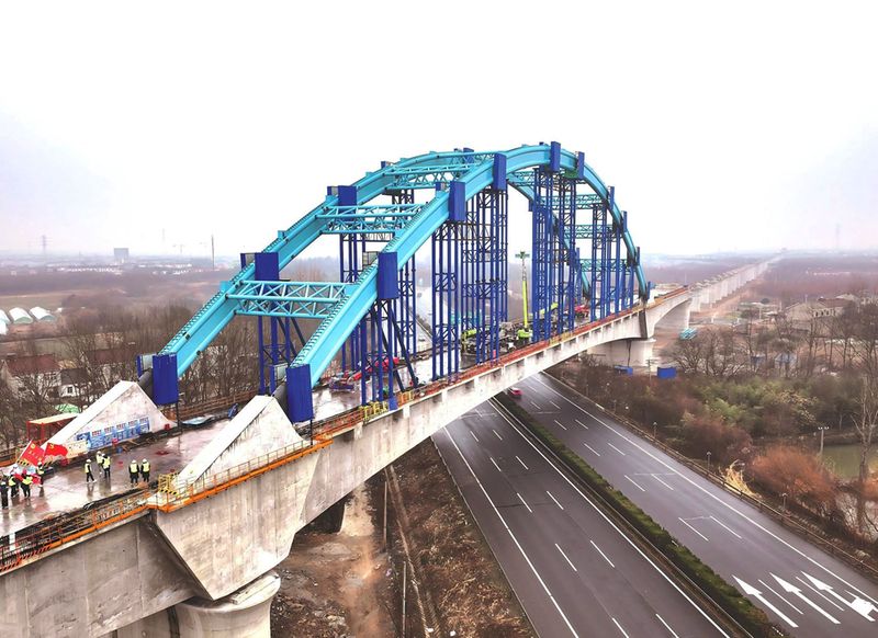 1月25日,中铁四局承建的宁(南京)淮(安)城际铁路跨南京绕城高速156米连续梁钢构拱合龙,至此工程主体结构施工基本完成。该梁拱主跨设计为下承式系杆拱,采用“先梁后拱”法施工,梁体采用悬臂浇筑完成后进行拱肋安装。