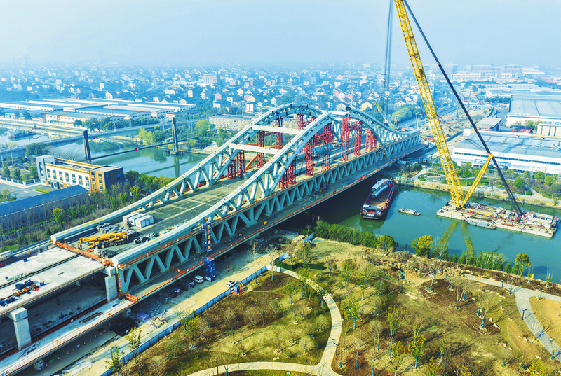 3月14日,中铁工业旗下中铁山桥参建的浙江省杭州市余杭东西大道运河大桥合龙。该桥是浙江省首座大跨径双层钢桁架拱桥,全长1.01公里,连接杭州市余杭与临平两区,呈东西走向横跨京杭大运河,主桥长300米,上层串联杭州都市区中环快速路,承载快速交通需求;下层为城市主干路与慢行系统,兼顾市民日常出行。中铁山桥负责约1.8万吨钢结构制造任务。在主桁片吊装中,项目团队创下京杭大运河单台浮吊独立吊装320吨超大桁片并成功完成空中转体翻身作业的佳绩。