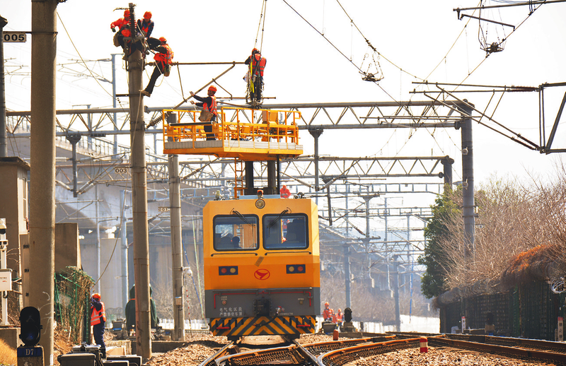 中铁电气化局运管公司上海维管处南京维管段拟用191个“天窗点”完成332条公里接触网检修任务,全力消除设备运行薄弱环节。图为在南京站至南京西调车场区域开展接触网设备检修养护作业。