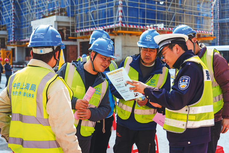 近日,中铁上海局安徽省贵池现代农村示范区项目部联合池州市浦兴乡村振兴公司、贵池区人社局、秋江派出所等多家单位,共同开展“防诈骗、防偷盗、防事故进工地”普法宣传活动,切实提升建设者的安全防范意识,保障生命财产安全,为工程建设营造良好的法治环境。图为民警发放《中华人民共和国道路交通安全法》宣传单、讲解施工生产相关管理条例。