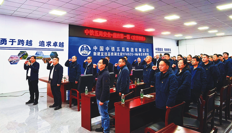 近日,中铁五局纪委、安质部门在宜涪高铁湖北段8标项目联合开展新春开工“安全·廉洁第一课”警示教育活动。图为“共建平安工程 共筑清风防线”宣誓签名活动。