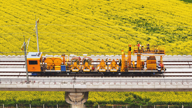 3月28日,(南)昌九(江)高铁庐山南站至共青城东站区间,随着恒张力放线轨道车缓缓启动,中铁武汉电气化局负责的昌九高铁全线接触网架设施工正式拉开帷幕,完成首条接触网导线架设。接触网导线作为列车的直接供电载体,其平直度、张力及空间几何参数直接关系到列车运行状态。通过实时监测并动态调整架线参数,此次架设的导线张力、平直度误差精准控制在0.1毫米内。昌九高铁线路全长138公里,设计时速350公里,全线接触网导线共计335.4公里,预计今年6月份全部架设完成。